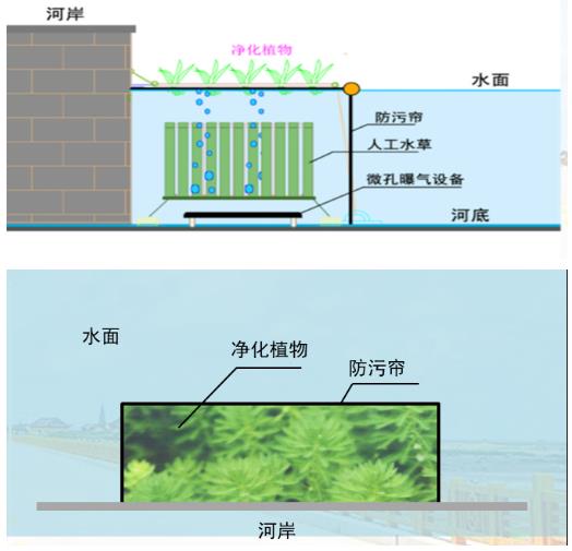 河道底部設(shè)置曝氣系統(tǒng),為立體浮床填料營造條件,凈化水質(zhì)。PyQ新型光催化網(wǎng)_水庫治理_河道治理_水生態(tài)修復(fù)_水環(huán)境治理與修復(fù)_江蘇雙良環(huán)境科技有限公司