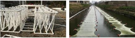 探索過(guò)程也并非是一帆風(fēng)順,經(jīng)歷了兩次失敗后,在第三次的方案調(diào)整中,他果斷摒棄了之前不銹鋼板固定PVC框的方式,首次采用了不銹鋼橡膠皮抱箍,將植物模塊放置在浮框中心,使得不銹鋼框架在水下“隱身”,在河道中2周左右能夠讓網(wǎng)穩(wěn)定在水下15cm左右的位置。新型布網(wǎng)方式的應(yīng)用,取消了原有浮球、配重的使用,這不僅有效降低了配件的使用成本,更使得敷網(wǎng)更加簡(jiǎn)易化,減少了人工施工難度,大幅度提高了現(xiàn)場(chǎng)工作效率。