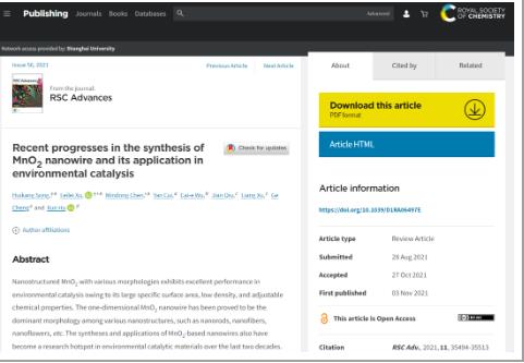 03介紹:2021年11月,南京信息工程大學(xué)、南京林業(yè)大學(xué)、濟南大學(xué)與江蘇雙良環(huán)境科技有限公司在《Royal Society of Chemistry》期刊上發(fā)表“Recent progresses in the synthesis of MnO2 nanowire and its application in environmental catalysis”一文。