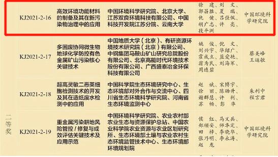 由江蘇雙良環(huán)境科技有限公司(以下簡稱“雙良環(huán)境)”聯(lián)合中國環(huán)境科學(xué)研究院與北京大學(xué)、中國科技開發(fā)院江蘇分院、云南大學(xué)等多家院所高校共同開發(fā)的《高效環(huán)境功能材料的制備及其在新污染物治理中的應(yīng)用》榮獲“2021年度環(huán)境保護(hù)科學(xué)技術(shù)獎”二等獎。