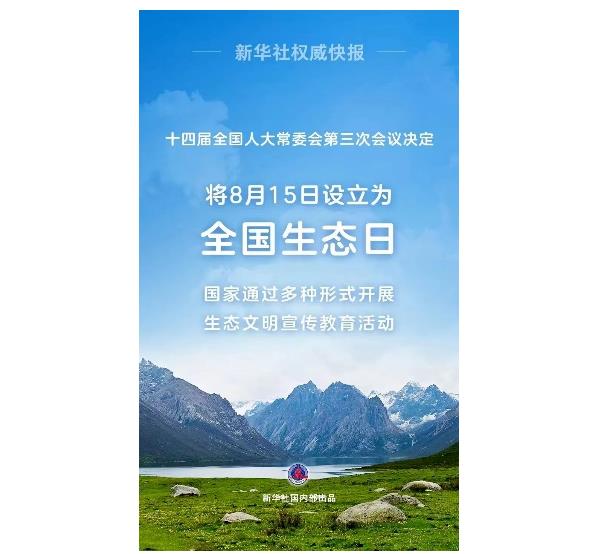 6月28日,十四屆全國人大常委會第三次會議決定:將8月15日設(shè)立為全國生態(tài)日。國家通過多種形式開展生態(tài)文明宣傳教育活動。習(xí)近平同志在浙江工作期間,2005年8月15日考察湖州市安吉縣,首次提出“綠水青山就是金山銀山”科學(xué)論斷。這一論斷是習(xí)近平生態(tài)文明思想的核心理念。將8月15日設(shè)立為全國生態(tài)日,比較符合確定紀(jì)念日、活動日時(shí)間的基本原則,能夠充分體現(xiàn)首創(chuàng)性、標(biāo)志性、獨(dú)特性。設(shè)立全國生態(tài)日,有利于更好學(xué)習(xí)宣傳貫徹習(xí)近平生態(tài)文明思想,提高全社會生態(tài)文明意識,增強(qiáng)全民生態(tài)環(huán)境保護(hù)的思想自覺和行動自覺,以釘釘子精神推動生態(tài)文明建設(shè)不斷取得新成效。