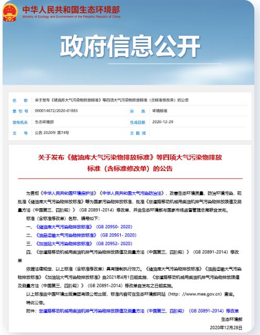 為貫徹《中華人民共和國環(huán)境保護法》《中華人民共和國大氣污染防治法》,防治環(huán)境污染,改善環(huán)境質(zhì)量,環(huán)境部印發(fā)《儲油庫大氣污染物排放標準》(GB 20950- 2020)。本標準規(guī)定了儲油庫儲存、收發(fā)油品過程中油氣排放控制要求、監(jiān)測和監(jiān)督管理要求,自2021年4月1日起實施。rk4新型光催化網(wǎng)_水庫治理_河道治理_水生態(tài)修復_水環(huán)境治理與修復_江蘇雙良環(huán)境科技有限公司