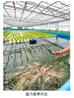 室內(nèi)魚菜共生是在蔬菜大棚中建設(shè)魚菜共作模式。設(shè)施養(yǎng)魚區(qū)建設(shè)養(yǎng)魚系統(tǒng)養(yǎng)殖名優(yōu)水產(chǎn)品并對(duì)水體凈化循環(huán),蔬菜種植區(qū)進(jìn)行土基蔬菜和水培蔬菜種植。養(yǎng)殖尾水過濾后形成高濃度液肥和低濃度水體兩部分,高濃度液肥發(fā)酵后作為蔬菜的有機(jī)肥,低濃度水體中營(yíng)養(yǎng)元素被吸收利用及有害物質(zhì)被分解后循環(huán)再養(yǎng)魚。