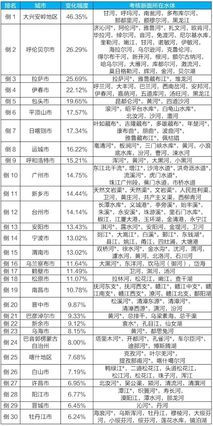 注:城市地表水環(huán)境質(zhì)量變化程度排名基于城市水質(zhì)指數(shù)變化率,按變化率從小到大的順序進(jìn)行排名,變化率為負(fù)值表示水質(zhì)改善,正值表示水質(zhì)變差。絕對(duì)值越大,表示變化程度越大。bGJ新型光催化網(wǎng)_水庫(kù)治理_河道治理_水生態(tài)修復(fù)_水環(huán)境治理與修復(fù)_江蘇雙良環(huán)境科技有限公司