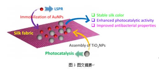 2NPs) 的復(fù)合涂層來增強(qiáng)絲織物的功能。通過原位合成將金納米粒子涂覆在絲織物上,然后在聚乙烯亞胺(PEI)的幫助下負(fù)載二氧化鈦納米粒子。 AuNPs通過其局部表面等離子體共振(LSPR)使真絲織物具有鮮艷的色彩,這種共振在TiO
