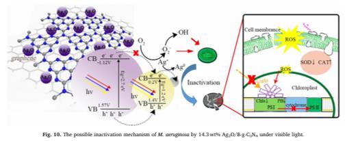 圖10.在可見光下14.3 wt%的Ag2O/g-C3N4致銅綠微囊藻失活的假設(shè)機理vx4新型光催化網(wǎng)_水庫治理_河道治理_水生態(tài)修復(fù)_水環(huán)境治理與修復(fù)_江蘇雙良環(huán)境科技有限公司