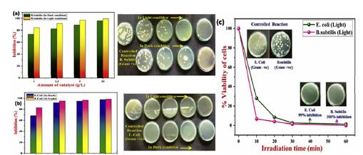 r1K新型光催化網(wǎng)_水庫治理_河道治理_水生態(tài)修復(fù)_水環(huán)境治理與修復(fù)_江蘇雙良環(huán)境科技有限公司圖1 不同光催化劑劑量對革蘭氏陽性菌—枯草芽孢桿菌(B. Subtilis)(a)和革蘭氏陰性菌—大腸桿菌(E. coli)(b)活性的抑制作用;光照催化時間對細胞活性的影響(c)。