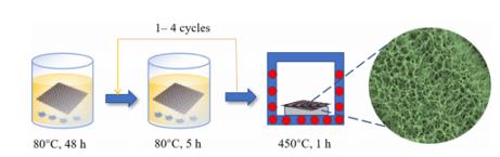 2納米線由于具有高比表面積和增加的電荷分離能力從而表現(xiàn)出優(yōu)異的光活性;然而對目標(biāo)污染物的有限吸附能力阻礙了光催化降解水中污染物。我們在此介紹一種溫和的方法,在碳布上沉淀可調(diào)厚度為1.5–4.5μm的銳鈦礦型TiO2納米線陣列,從而同時獲得高吸附容量和優(yōu)異的光活性。與沉積在金屬Ti基底上的TiO