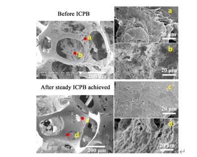 r1K新型光催化網(wǎng)_水庫治理_河道治理_水生態(tài)修復(fù)_水環(huán)境治理與修復(fù)_江蘇雙良環(huán)境科技有限公司圖1 ICPB前和ICPB穩(wěn)定階段海綿載體的SEM圖像。(a)和(c)分別為ICPB前和ICPB穩(wěn)定階段的外部圖像,(b)和(d)分別為ICPB前和ICPB穩(wěn)定階段的內(nèi)孔圖像