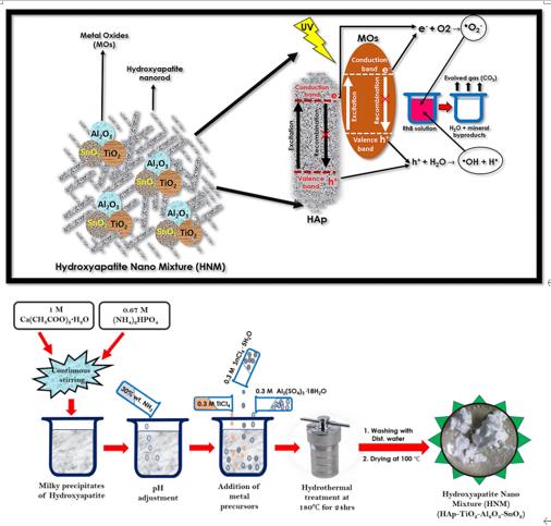 3)納米混合物與1-D羥基磷灰石(HAp)納米棒協(xié)同作用,用于人工合成廢水中RhB的去除和水分解析氫 引自:Kingdom Alorku,M. Manoj,Cui Yanjuan,etc.Nanomixture of 0-D ternary metal oxides (TiO