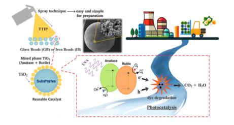 2)因其成本低、用途廣而被廣泛用作催化劑。然而,使用二氧化鈦粉末會導(dǎo)致很難從處理過的廢水中分離。因此,本課題研究了二氧化鈦在玻璃和鐵珠等兩種不同基質(zhì)上的固定化。采用噴霧液相法制備復(fù)合材料分散到基材上,然后材料在不同的溫度(600-750?C)煅燒。在700?C煅燒溫度下,SEM和EDS分析表明,TiO