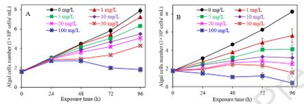 4對(duì)兩種藻類(銅綠微囊藻、普通小球藻)72小時(shí)的平均有效濃度分別為(56.4, 89.6 mg/L)和(12.5, 20.6 mg/L)。Cu-g-C