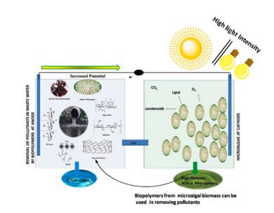 fTW新型光催化網(wǎng)_水庫治理_河道治理_水生態(tài)修復(fù)_水環(huán)境治理與修復(fù)_江蘇雙良環(huán)境科技有限公司圖3:圖文摘要fTW新型光催化網(wǎng)_水庫治理_河道治理_水生態(tài)修復(fù)_水環(huán)境治理與修復(fù)_江蘇雙良環(huán)境科技有限公司含有微藻的光合微生物燃料電池(PMFCs)在處理廢水方面具有巨大潛力,同時它能將光能轉(zhuǎn)化為電能。這種電池的效率直接取決于光照強度對藻類的生長。光照強度越強,其產(chǎn)生富含生物聚合物的生物質(zhì)潛力越大。這種生物聚合物是由在陽極的細(xì)菌和在陰極的藻類同時作用產(chǎn)生,反之亦然。從生物資源中獲得的生物聚合物能夠單獨添加或者與納米材料結(jié)合后添加在污水中作為納米吸附劑。這些納米吸附劑通過去除金屬和染料等污染物,進一步提高 PMFC的效率。在這篇文章中首先闡述了不同的光照強度對微藻生長的影響、硅藻在PMFC中的重要性以及藻類對PMFCs效率的影響。其次論述了從不同的生物資源中回收的生物聚合物及其在去除金屬、染料中的作用,以及他們在循環(huán)生物經(jīng)濟中的影響。最后,敘述了該研究領(lǐng)域的瓶頸和未來前景。