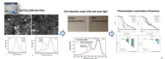 2/聚硅氧烷(SiBi)薄膜。通過掃描電子顯微鏡(SEM)、透射電子顯微鏡(TEM)、X射線光電子能譜(XPS)、紫外光電子能譜(UPS)、拉曼光譜和水接觸角測(cè)量對(duì)制備的涂層進(jìn)行了表征。在光催化試驗(yàn)中,觀察到用GO改性的所制備的涂層的顏色發(fā)生了強(qiáng)烈的變化。光催化試驗(yàn)后薄膜的XPS分析表明GO發(fā)生了還原。研究了制備的涂層在UVA和自然陽(yáng)光照射下對(duì)水產(chǎn)養(yǎng)殖水中自然產(chǎn)生的微生物的滅活作用。在UVA照射下,研究了所制備涂層中rGO濃度對(duì)靶菌嗜水氣單胞菌和吉列檸檬酸桿菌滅活的影響。與吉列檸檬酸桿菌相比,嗜水氣單胞菌對(duì)光催化滅活更敏感。rGO濃度為1%和5%的薄膜對(duì)目標(biāo)微生物有較高的光催化滅活作用。進(jìn)一步測(cè)試了rGO/TiO