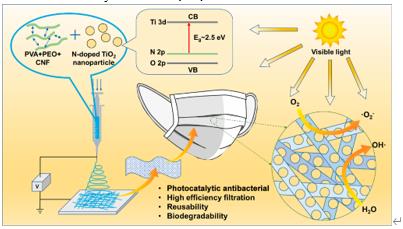 9Zm新型光催化網(wǎng)_水庫(kù)治理_河道治理_水生態(tài)修復(fù)_水環(huán)境治理與修復(fù)_江蘇雙良環(huán)境科技有限公司在災(zāi)難性的SARS-CoV-2(2019冠狀病毒疾?。┐罅餍衅陂g,美國(guó)疾病控制和預(yù)防中心強(qiáng)烈建議使用個(gè)人防護(hù)裝備(PPE)進(jìn)行自我保護(hù)。然而,個(gè)人防護(hù)用品的大規(guī)模使用在回收和消毒使用過的口罩方面遇到了重大挑戰(zhàn)。為了解決舊口罩的相關(guān)塑料污染問題,在這項(xiàng)工作中,我們?cè)O(shè)計(jì)了一種可重復(fù)使用、可生物降解和抗菌的口罩。通過聚乙烯醇(PVA)、聚環(huán)氧乙烷(PEO)和纖維素納米纖維(CNF)的靜電紡絲,然后酯化和沉積氮摻雜的TiO