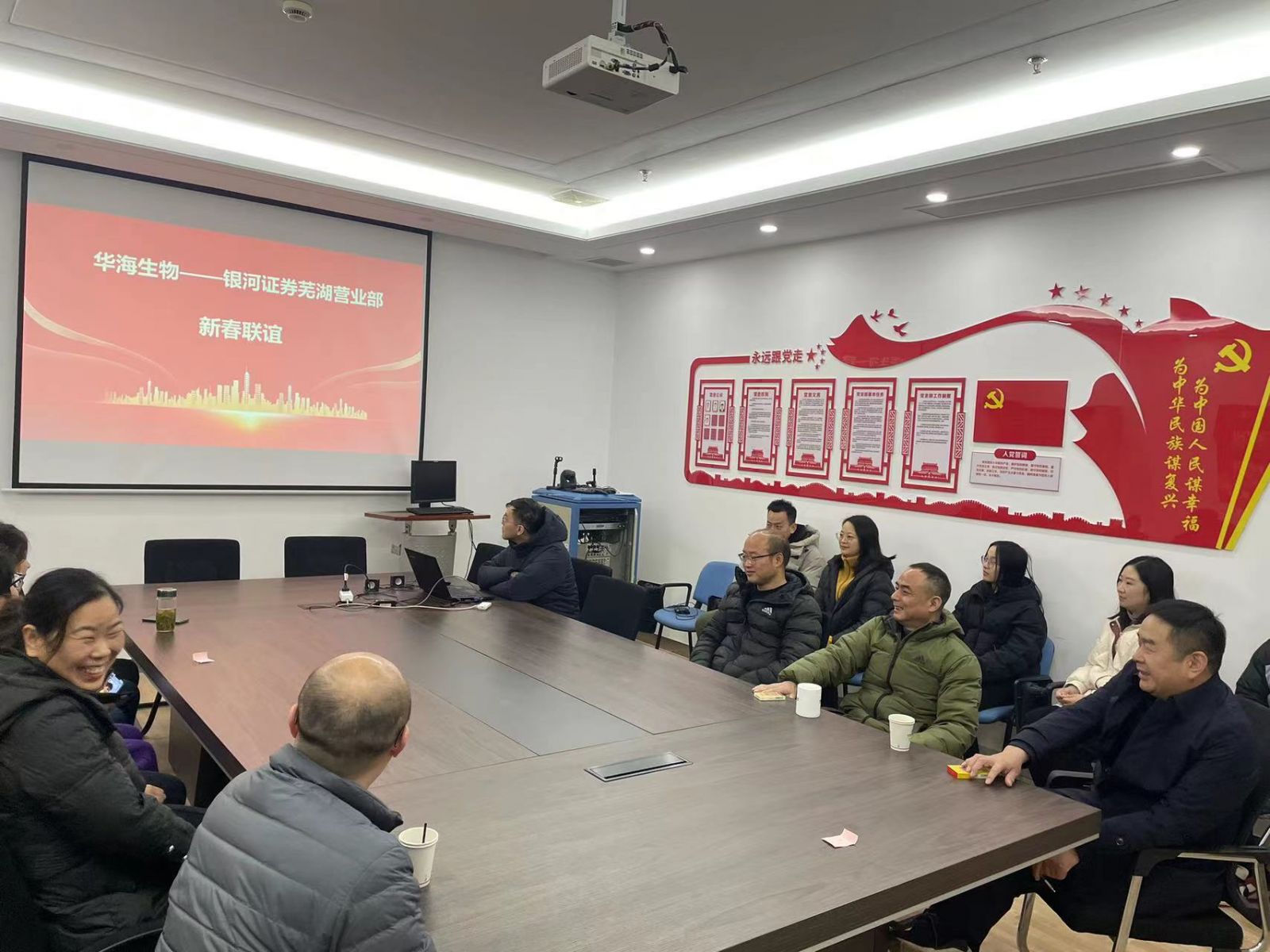 2023年12月23日上午,和風(fēng)送暖,天氣格外晴朗,由華海生物和銀河證券蕪湖營業(yè)部攜手主辦的新春聯(lián)誼活動(dòng)在銀河證券蕪湖營業(yè)部拉開了序幕。會(huì)上,華海公司總經(jīng)理茆總表示希望攜手銀河證券同進(jìn)步、共發(fā)展,友誼長存!銀河證券蕪湖營業(yè)部負(fù)責(zé)人高總對(duì)華海生物一行表示熱烈歡迎!