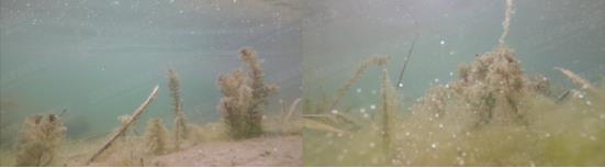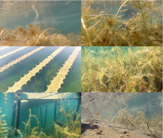 T1池:水下通透、自然生長的狐尾藻、蘿卜螺。